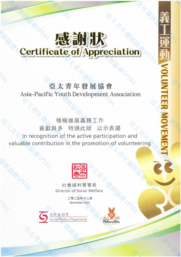 本組織定名為「亞太青年發展協會」(以下簡稱「本協會」),英文譯名為「Asia-Pacific Youth Development Association」,縮寫為「APYDA」。香港政府註冊牌照編號:79008176-000-10-25-8。