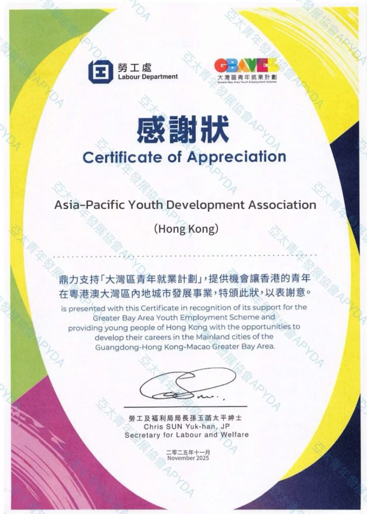 亞太青年發展協會(Asia-Pacific Youth Development Association)縮寫為「APYDA」,香港政府註冊牌照編號:79008176-000-10-25-8,組織定位為非牟利。是立足香港、輻射亞太地區的青年發展平台,核心成員以華裔青年為主,尤其匯聚了來自香港及周邊地區的優秀青年代表。