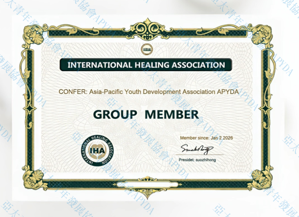 近日,在聯合國社會事務部登記,立足香港、輻射亞太的非牟利青年組織亞太青年發展協會(Asia-Pacific Youth Development Association, APYDA),今日正式獲批成為國際療愈協會(International Healing Association, IHA)團體會員,標誌著雙方在青年心理健康、身心成長及國際交流領域的合作邁出關鍵一步。