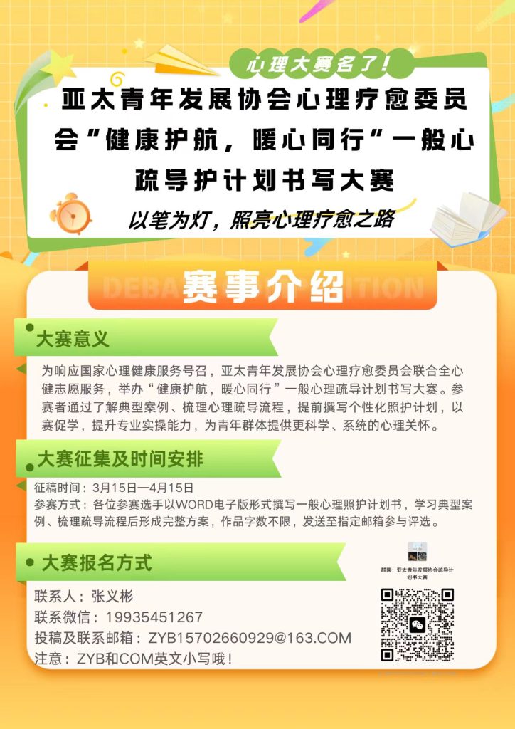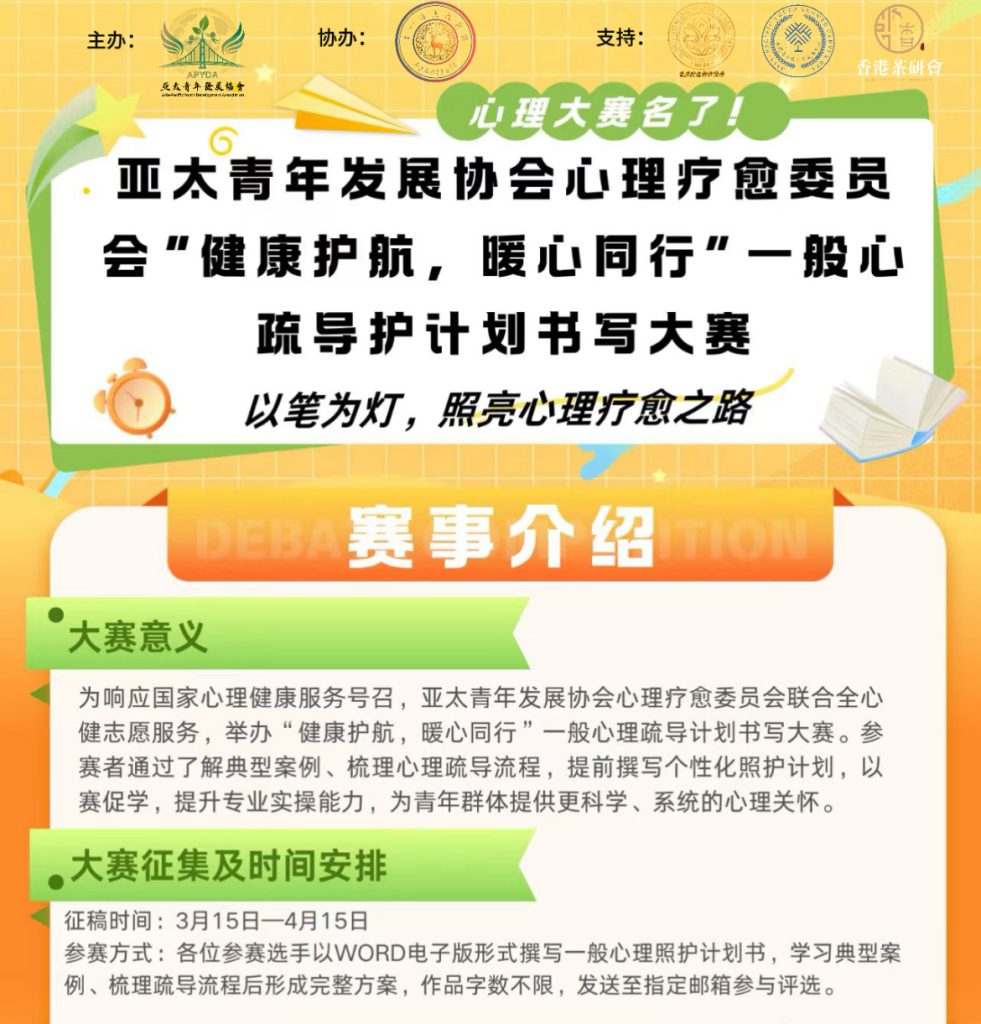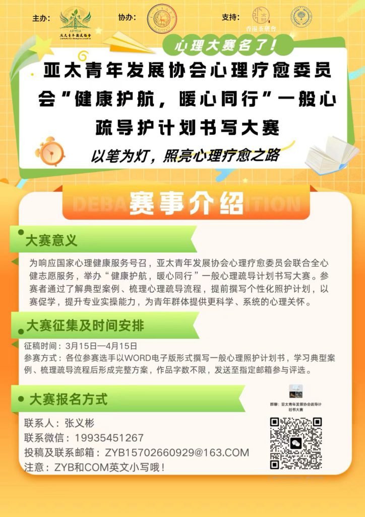 為深入推進新時代心理健康服務體系建設,提升青年心理服務專業素養,亞太青年發展協會心理治癒委員會聯合全心健誌願服務,特舉辦 「健康護航,暖心同行」一般心理輔導計劃書寫比賽 。現面向全體青年學生、心理志願者及心理健康愛好者正式招募參賽選手,期待你的專業與溫暖同台亮麗!