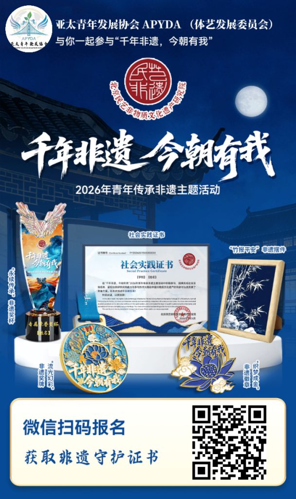 近日,由北京民藝非物質文化遺產研究院主辦的「千年非遺,今朝有我」2026青年傳承非遺主題活動正式展開。亞太青年發展協會作為參與機構,積極投入是次全國性青年文化活動,由本會 體藝發展委員會 號召本會及各地青年認識非遺、走進非遺、守護非遺,推動中華優秀傳統文化持續傳承。