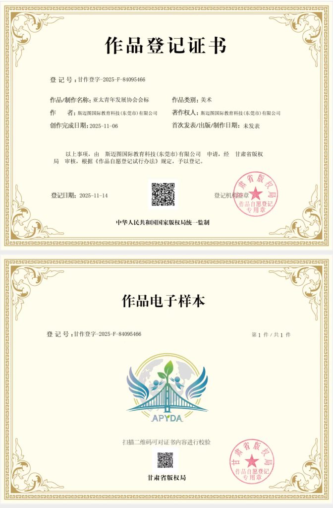 為規範協會視覺標識的使用與管理,切實保護協會知識產權,本會委託斯邁圖國際教育科技(東莞市)有限公司申請的亞太青年發展協會會標,已通過國家版權管理部門審核,順利完成作品版權登記。相關資訊如下: