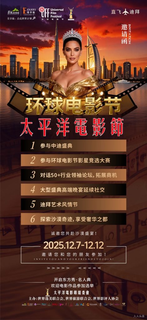 當沙漠明珠的鎏金暮色撞上電影藝術的璀璨星光,一場屬於亞太影視人的國際盛會即將在迪拜啓幕——由太平洋電影節組委會主辦。亞太青年發展協會作為太平洋電影節的合作單位,共同參與的環球電影節、第五屆太平洋電影節暨“金人獎”頒獎盛典,將於2025年12月7日至12日登陸迪拜,為亞太青年創作者搭建跨越國界的展示與交流平台。