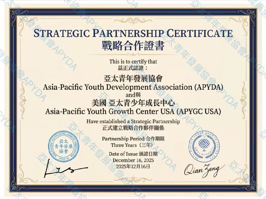 近日,亞太青年發展協會(APYDA)與美國亞太青少年成長中心(APYGC USA)正式簽署戰略合作協議,雙方確立為期三年的深度合作夥伴關係,這一重要合作將為亞太地區青少年搭建更廣闊的國際化成長平台,開啟跨地域、跨領域青年發展新篇章。